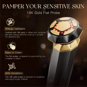 Spécialiste des soins pour peaux sensibles : Le masseur électrique pour le visage, doté d’une tête plate en or 18 carats, présente trois avantages clés :