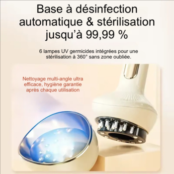 🧼 Base de désinfection UV : stérilisation automatique à 99,99 %, hygiène parfaite après chaque utilisation.