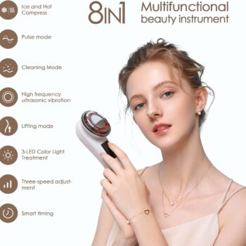 Masseur Visage 8 en 1 avec Soins Complets pour la Peau: Le masseur pour le visage Bestauty offre une gamme complète de fonctionnalités : nettoyage, compressions à froid et à chaud, soin lumineux avec 3 LED, vibrations ultrasoniques à haute fréquence, absorption de nutriments par pulsation, et massage EMS. Cet appareil anti-rides pour le visage dispose d’un écran LCD, d’une batterie rechargeable de 1000 mAh, et d’un support pratique.
