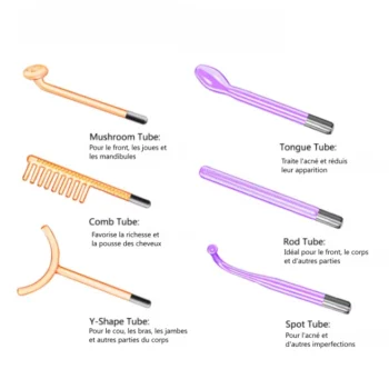 L’appareil haute fréquence est équipé de six tubes en verre distincts, chacun conçu pour une utilisation spécifique. Le tube en forme de champignon est idéal pour traiter les zones étendues, comme les joues et la mâchoire, en réduisant les rides. Le tube en forme de langue cible l’acné et les imperfections cutanées, tandis que le tube coudé est parfait pour les zones sensibles, telles que les cernes sous les yeux et le nez. Le tube peigne stimule la pousse des cheveux, et le tube en forme de Y est conçu pour traiter le cou, les bras et les genoux. Enfin, le tube en tungstène est destiné au front et aux autres zones plus larges du visage.