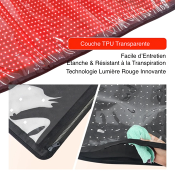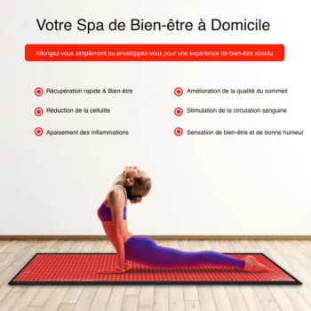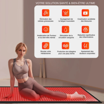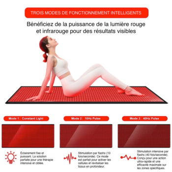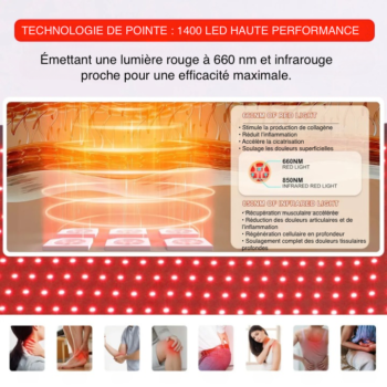 Ce tapis de thérapie grand format combine les bienfaits de la lumière rouge (660 nm) et de l’infrarouge (850 nm) pour offrir un traitement complet du corps. Avec ses 1400 LEDs réparties uniformément, il couvre une large surface, idéal pour des séances de relaxation, de soulagement de douleurs et de stimulation du métabolisme. Conçu pour un usage domestique ou professionnel, il permet de profiter des bienfaits de la photobiomodulation de manière simple, efficace et non invasive.